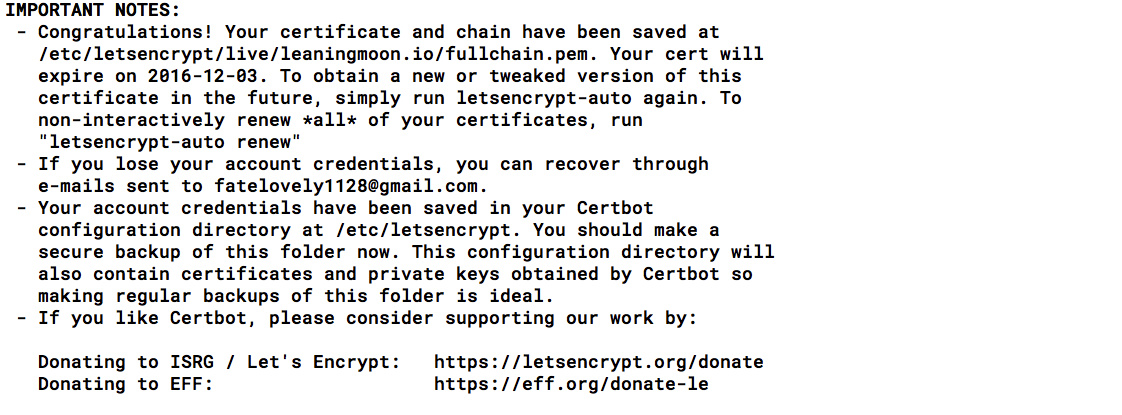 可以看到,最为关键的证书文件存放在/etc/letsencrypt/live/leaningmoon.io/fullchain.pem。